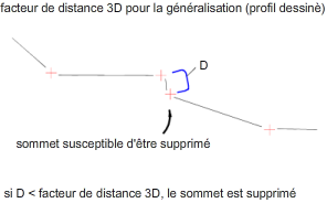S'ils sont considérés comme inutiles pour l'emplacement de la ligne, en fonction des facteurs de généralisation de l'angle, du talus, de la longueur et de la distance 3D, les sommets sont généralisés. Les points sélectionnés pour la généralisation sont surlignés en rouge.