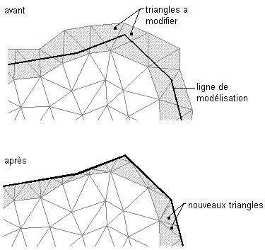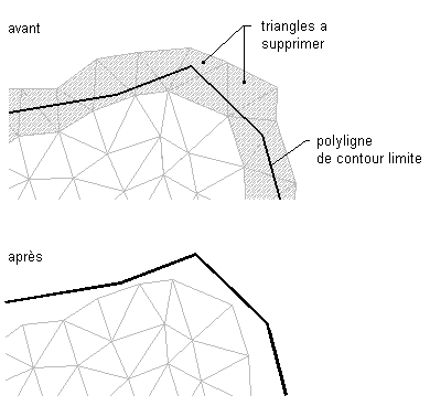 Si vous créez une limite de contour sans lignes de modélisation le long de cette dernière, seuls les triangles qui sont à l'intérieur ou à l'extérieur de la limite de contour sont concernés :