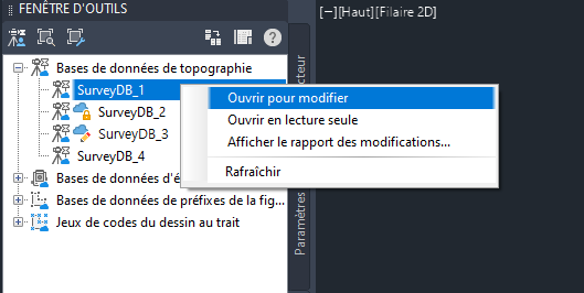- Dans l’onglet Topographie de la fenêtre d’outils, cliquez avec le bouton droit de la souris sur l’ensemble Bases de données de topographie.