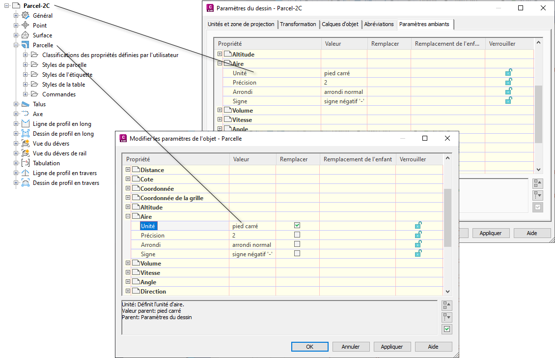 Chaque objet de niveau inférieur de la hiérarchie de paramètres peut hériter des paramètres de niveau supérieur ou les remplacer. L'illustration suivante décrit le remplacement des unités de zone au niveau de l'objet Parcelles.