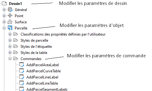 Le niveau d'ensemble Commandes de l'arborescence Paramètres vous permet de remplacer les paramètres d'objet et du dessin, commande par commande. Vous pouvez aussi indiquer des paramètres spécifiques à la commande.