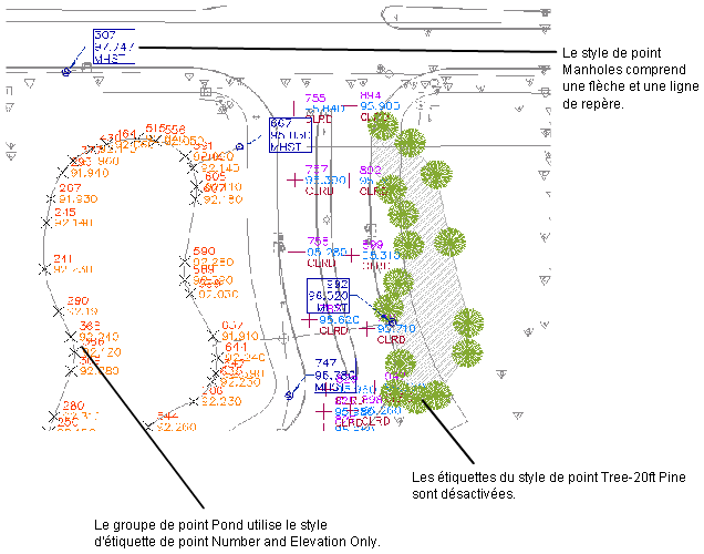Quand vous créez des points dans un dessin, vous pouvez les étiqueter automatiquement en utilisant les critères d'étiquetage prédéfinis.