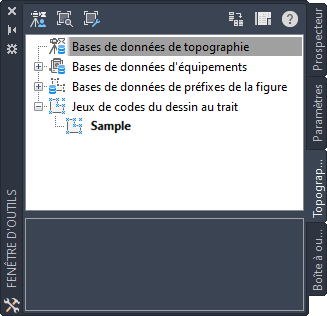 Les données de topographie sont gérées dans l'onglet Topographie de la fenêtre d'outils, contrairement aux autres objets qui sont gérés dans l'onglet Prospecteur.