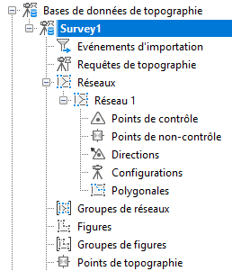 Cet onglet affiche les données de topographie des projets regroupées dans des bases de données correspondant aux projets de topographie, aux équipements et aux préfixes de figure. Les bases de données de projet contiennent les points de topographie, les réseaux et les figures. Les bases de données d'équipement contiennent les écarts standard et d'autres paramètres opérationnels relatifs aux différents éléments des équipements de topographie. Les bases de données de préfixes de figure contiennent les routines de conversion appliquées lors de la création de parcelles, de constructions et d'autres figures à partir de points de topographie.