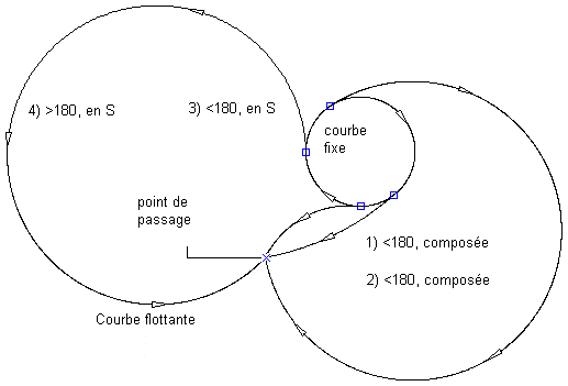 L'illustration suivante montre une courbe composée flottante associée à une courbe et quatre solutions possibles pour un rayon et un point de passage donnés : Elle montre également les variables pour les solutions supérieures et inférieures à 180 degrés et les variables inverses et composées :