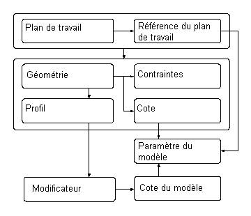L'illustration suivante présente les objets qui composent le modèle. Les flèches indiquent le sens de la relation entre les objets. Par exemple, lorsque vous modifiez la géométrie, la ligne de profil en long est modifiée, puis le modificateur, et ainsi de suite. Reportez-vous à cette illustration lors de l'étude de chaque objet pour vous aider à comprendre les relations entre les objets.
