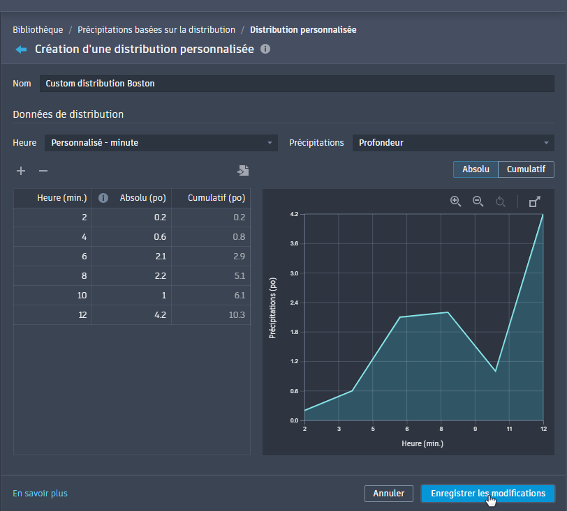 - Personnalisé – Minute : minimum de deux entrées, la durée totale de la courbe sera utilisée comme durée pour tout événement de précipitations utilisant cette distribution.