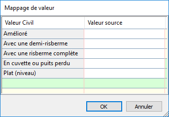 Pour chaque valeur Civil répertoriée, vous pouvez entrer une valeur source qui a été assignée à l’attribut ArcGIS. Si la valeur source est trouvée pour un composant dans la source, la valeur Civil sera appliquée à ce composant.