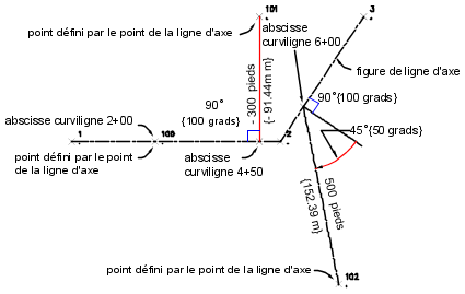 Le point 100 est placé à l'abscisse curviligne 200 avec un décalage de zéro. Le point 101 est placé à l'abscisse curviligne 450 avec une distance de décalage gauche de 91.44. Le point 102 est placé à l'abscisse curviligne 600 avec une distance de décalage droite de 152.4 et un angle oblique de 50.