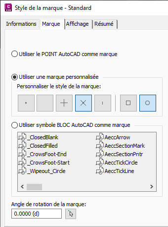 Les styles de marque peuvent être configurés de manière à utiliser des points AutoCAD, des symboles de marque personnalisés ou des blocs.