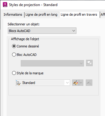 Styles de projection de l'onglet Paramètres de la fenêtre d'outils. Utilisez l'onglet Ligne de profil en travers pour configurer les paramètres d'affichage du dessin de profil en travers.