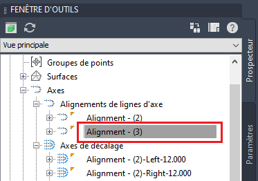 Alignements de lignes d'axe de l'arborescence du prospecteur. Cette option permet de localiser rapidement un axe d'intersection dans l'arborescence du prospecteur.