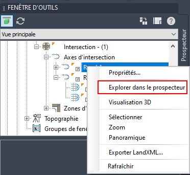 L'option Explorer dans le prospecteur est disponible pour les alignements de la ligne d'axe, les axes de référence pour le décalage et les axes de raccordement à partir des ensembles Axes d'intersection et Zones d'intersection.