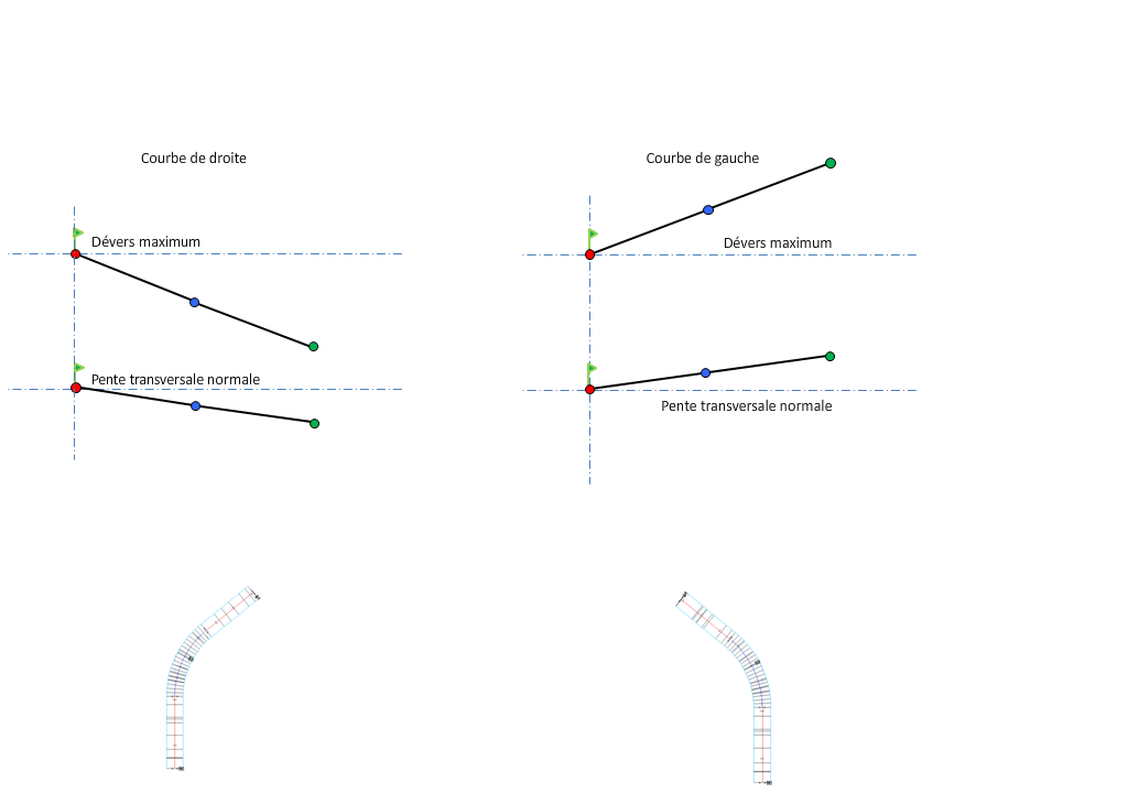Pour obtenir une explication des diagrammes de dévers, reportez-vous à la rubrique A propos des méthodes de pivot d'axe de rotation du dévers.