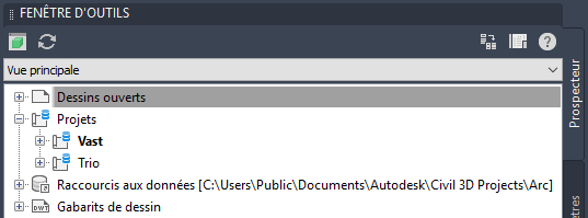 La vue principale de l'arborescence du prospecteur contient quatre ensembles associés aux dessins et aux projets : Dessins ouverts, Projets, Raccourcis aux données et Gabarits de dessin.