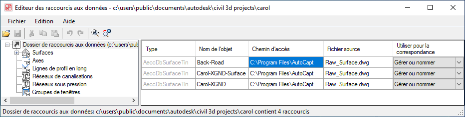 Avant de modifier des raccourcis aux données, assurez-vous qu'aucun autre utilisateur n'est en train de créer ou de modifier le même jeu de raccourcis aux données dans Autodesk Civil 3D. Sinon, un utilisateur peut écraser les modifications apportées par un autre utilisateur.