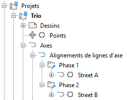 Vous pouvez classer les objets de projet dans des sous-dossiers à l'aide d'Autodesk Vault. Les sous-dossiers sont affichées dans le prospecteur s'ils contiennent un objet de projet. L'illustration suivante montre deux sous-dossiers d'axes de projet dans le prospecteur présents dans le dossier Alignement du trait d'axe.