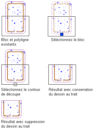 . L'ensemble du dessin au trait sélectionné en premier à l'extérieur de la limite de contour de découpe est effacé. Si vous choisissez d'effacer la limite de contour de la découpe, les limites sont redessinées pour toute entité avec limite de contour fermée à l'intérieur de la zone de découpe. Mais tous les objets avec limite de contour ouverte ayant été découpés restent ouverts.