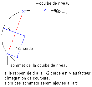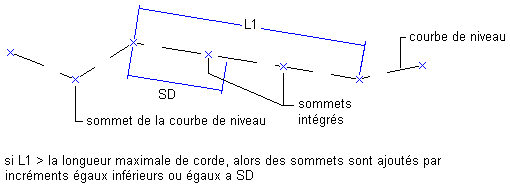La longueur maximale de corde est la distance maximale entre les sommets. Si la distance entre les sommets sur une courbe de niveau est supérieure au facteur d'intégration, alors des points sont ajoutés le long de la courbe de niveau à intervalles égaux inférieurs ou équivalents à la longueur maximale de corde. Plus la distance est petite, plus le nombre de points ajoutés est important.