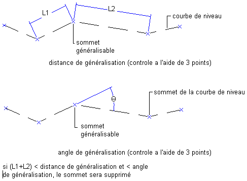 Un point est retiré de la courbe de niveau en calculant son emplacement par rapport aux sommets avant et après ce dernier. Si la longueur entre ces trois points est inférieure à la valeur de la longueur de généralisation et si l'angle de fléchissement est inférieur à la valeur de l'angle de généralisation, alors le point au milieu n'est pas ajouté au fichier de données de courbe de niveau.