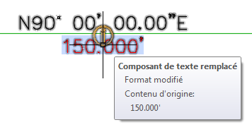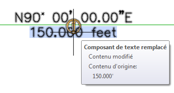 Contenu modifié : indique que le contenu de l'étiquette a été modifié, ou que le contenu et le format ont changé. Dans l'illustration suivante, le symbole pied (') a été remplacé par "pieds".