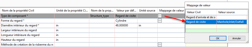 L’exemple suivant montre comment utiliser la boîte de dialogue Mappage de valeur afin de mapper les valeurs source d’un attribut « Structure_type » et de les importer dans Civil 3D en tant que regards de visite.