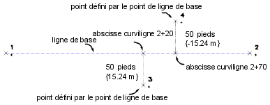 Le point 3 est décalé d'une distance de 15.24 vers la droite de la ligne de base à l'abscisse curviligne 2+20 et le point 4 est décalé d'une distance de 15.24 vers la gauche de la ligne de base à l'abscisse curviligne 2+70. Les distances sont mesurées dans les unités courantes, sauf si vous tapez un suffixe approprié.