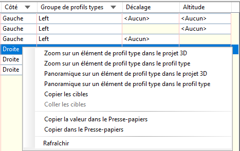 Vous pouvez utiliser les commandes du menu contextuel pour copier des cibles à partir d’un élément de profil type et les coller dans un ou plusieurs autres éléments de profil type, ainsi que pour effectuer un zoom et un panoramique sur les éléments de profil type.