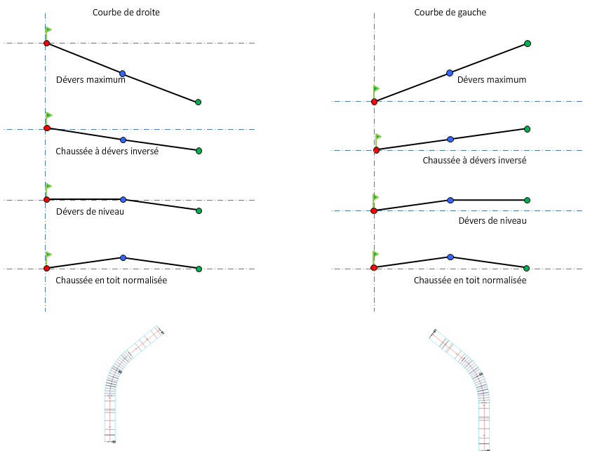 Pour obtenir une explication des diagrammes de dévers, reportez-vous à la rubrique A propos des méthodes de pivot d'axe de rotation du dévers.