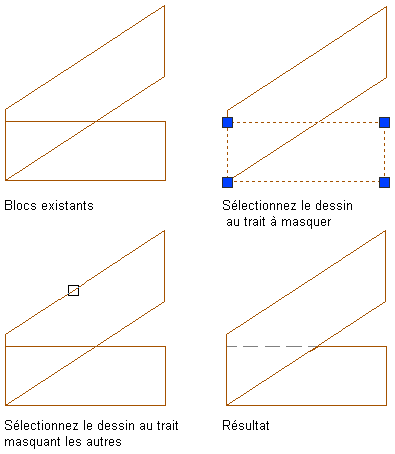 Masquez une zone de dessin au trait par rapport à d'autres dessins au trait. Cette fonctionnalité permet d'indiquer qu'une entité est prolongée derrière ou sous une autre entité affichée au premier plan. Le dessin au trait masqué est placé sur le calque spécifié par la clé de calque Masqué.