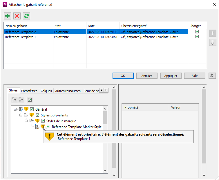 Lorsque vous attachez un gabarit de référence supplémentaire à un dessin, il est ajouté en haut de la liste des gabarits en tant que gabarit avec la priorité la plus élevée, et vous êtes averti s’il existe des doublons de composants dans un autre gabarit de référence. Pour en savoir plus sur la gestion des doublons, reportez-vous à la rubrique