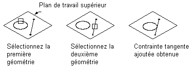 Peut être définie entre une géométrie incurvée (comme un cercle ou un arc) et une autre géométrie incurvée ou une ligne. Cette contrainte rend deux courbes tangentes, même si elles ne partagent aucun point physiquement. La tangence est généralement utilisée pour appliquer une ligne en tant que contrainte à un arc ou à un cercle.
