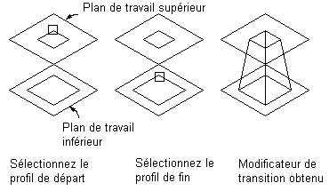 Un modificateur de transition crée un corps de transition entre deux lignes de profil en long. Une transition inclut une ligne de profil en long de début et une ligne de profil en long de fin qui ne doivent pas se situer dans le même plan de construction. Les références du point assurent l'alignement des lignes de profil en long entre les plans de construction ; toutefois, les centres n'ont pas besoin d'être alignés.