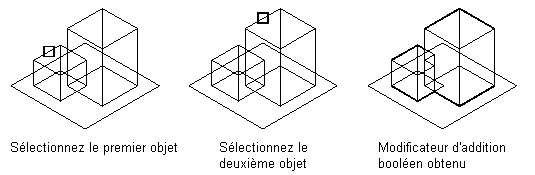 Un modificateur d'ajout booléen combine deux objets pour en créer un seul. Ce modificateur suppose un concept d'addition de base : la géométrie située au sein d'une autre géométrie est supprimée lorsque ces deux géométries sont additionnées. Ce modificateur est utile lors de la création de modèles de composants insérés dans le dessin exactement tels qu'ils étaient dans le modèle.