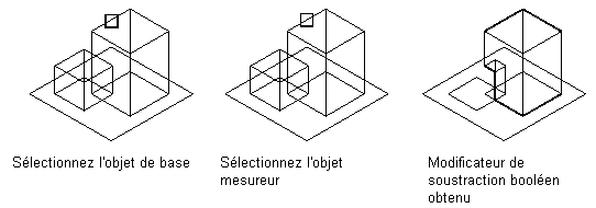 Un modificateur de soustraction booléenne soustrait un ou plusieurs objets d'un autre objet pour créer un nouvel objet. Le modificateur de soustraction booléenne utilise une formule de base lors de la création de l'objet résultant : les objets mesureur sont supprimés de l'objet de base. Pour afficher les résultats dans le modèle, les objets mesureur doivent couper l'objet de base. Lorsqu'il n'existe aucune intersection d'objets, les objets mesureur sont supprimés de l'objet de base sans aucune modification apparente dans le modèle.