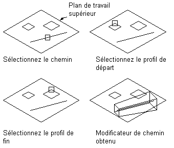 Un modificateur de chemin balaye une ligne de profil en long le long de la géométrie du parcours. Il crée une fonction 3D basée sur les lignes de profil en long de début et de fin d'une géométrie, telle qu'une ligne ou un arc. Les lignes de profil en long de début et de fin peuvent être différents.