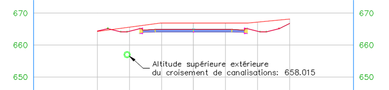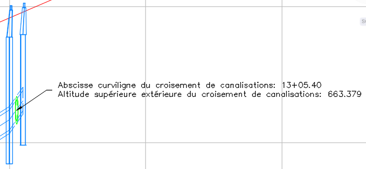 Si le croisement de canalisation est déplacé vers une autre abscisse curviligne le long de l'axe, l'étiquette sera mise à jour avec les nouvelles informations d'abscisse curviligne et d'altitude.