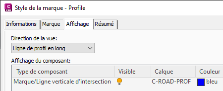 Le composant Marque/Ligne verticale d'intersection contrôle l'affichage de la marque (permettant d'afficher les polylignes 3D, les figures de topographie et les lignes de profil en long d'intersection) et de la ligne verticale d'intersection (qui permet d'afficher les intersections des axes).