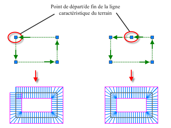 Pour contourner ce problème, il est conseillé de dessiner la ligne caractéristique du terrain afin qu’elle commence et se termine à un emplacement autre que le coin, comme indiqué dans l’illustration suivante, sur la droite.