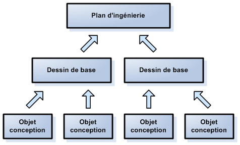 Quelle que soit la structure du projet, il est recommandé d'organiser les objets de conception individuels tels que les axes et les surfaces en dessins distincts. Ces objets sont référencés dans des dessins de base lors de la conception. Les plans d'ingénierie complets et les dessins de production finaux sont conçus à partir de références d'objets et de références de dessins.