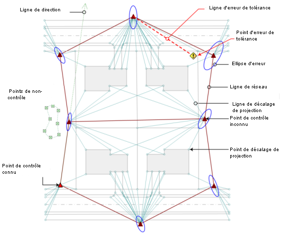 Un réseau de topographie est une série de lignes interconnectées représentant les abscisses curvilignes ou les configurations des instruments observés. Il contient toutes les observations, les configurations et les directions connues ainsi que tous les points de contrôle connus associés.