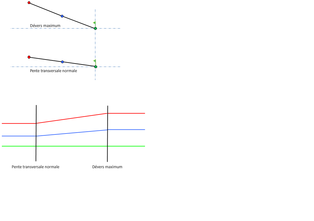 Pour obtenir une explication des diagrammes de dévers, reportez-vous à la rubrique A propos des méthodes de pivot d'axe de rotation du dévers.