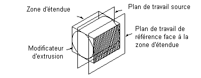 Un plan de construction de référence est un plan disposé sur la face de l'étendue d'un modificateur. Chaque modificateur dispose d'une étendue invisible, ou zone de contour, qui définit l'étendue de l'objet. Vous pouvez créer un plan de construction référençant un des plans de l'étendue. Pour définir un plan de construction de référence, sélectionnez un modificateur et un plan de construction source représentant la direction du plan à créer. L'étendue de l'objet, ou zone de contour, est détectée et vous pouvez sélectionner deux plans de construction de référence corrects. Si le modificateur est déplacé ou redimensionné, le plan de construction de référence l'est aussi.