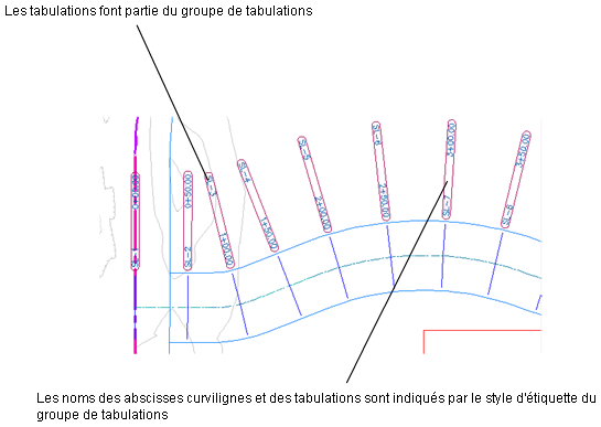 Quand vous créez des tabulations le long d'un axe, les objets ligne de profil en travers d'un jeu spécifique de surfaces, modèles de projets 3D ou réseaux de canalisations existants ou proposés sont aussi créés. Les objets échantillons et styles par défaut de chaque tabulation sont spécifiés par un groupe de tabulations. D'autres objets échantillons peuvent être ajoutés au groupe de tabulations après la création des tabulations. Pour tracer les lignes de profil en travers d'un dessin, créez des dessins de profils en travers individuels ou multiples.