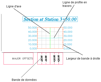 L’objet de dessin de profil en travers affiche des données de ligne de profil en travers (terrain naturel et fini/conçu) sur une tabulation, sur n’importe quelle abscisse le long d’un axe horizontal. Le dessin de profil en travers montre une ligne de profil en travers créée soit à partir d'une surface (triangulée ou de projet 3D), soit à partir d'un projet 3D, c'est-à-dire un profil type sur une abscisse spécifiée, soit à partir d'un réseau de canalisations. Vous pouvez aussi d'afficher les bandes au-dessus ou au-dessous du dessin de profil en travers.
