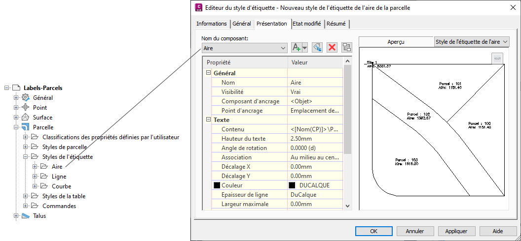 Prévisualisation du style d'étiquette personnalisé pour l'aire de parcelle
