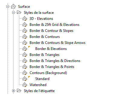 L'illustration suivante montre un exemple d'ensemble de styles d'objet dans l'arborescence des paramètres :