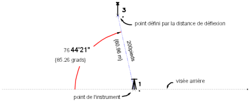 Le point 3 est placé en pivotant un angle de déflexion de 85.2657 vers la droite à partir de l'extension de la ligne de visée arrière à une distance de 200. Les angles et les distances sont mesurés dans les unités courantes, sauf si vous tapez un suffixe approprié.