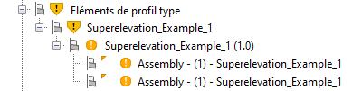 Lorsqu’un chemin d’accès à un fichier PKT d’élément de profil type doit être mis à jour, des symboles et des info-bulles s’affichent sur les éléments dans l’arborescence du prospecteur pour vous le signaler.