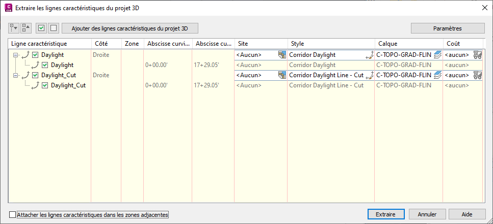 La boîte de dialogue Extraire les lignes caractéristiques du terrain du projet 3D s’affiche.